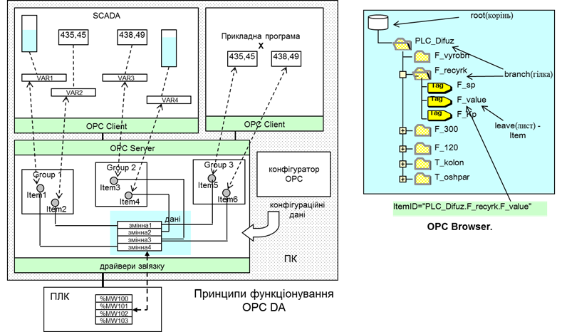 Технологія ОРС DA ґрунтується на клієнт-серверній архітектурі. ОРС-клієнт користується послугами ОРС-сервера, використовуючи СОМ-інтерфейси його об’єктів. У наведеному на рис. 3.3 прикладі ОРС-клієнтом є SCADA-програма, завданням якої є відображення чотирьох змінних (%MW100-%MW103), які знаходяться на ПЛК. OPC-сервер отримує необхідні дані через драйвери зв’язку і зберігає їх у своїй базі даних реального часу. Для того щоб доступитися до даних ОРС-сервера, ОРС-клієнт створює для себе ОРС-Group (Group1, Group2), в яких створює ОРС Item (Item1, Item2), що посилаються на ці дані.